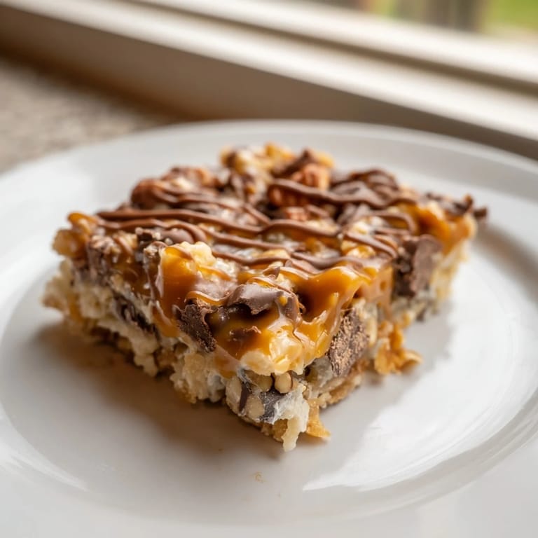 Pin A decadent, chewy dessert bar layered with chocolate, butterscotch, coconut, nuts, and a luscious salted caramel drizzle โ a truly magical treat perfect for any sweet tooth.