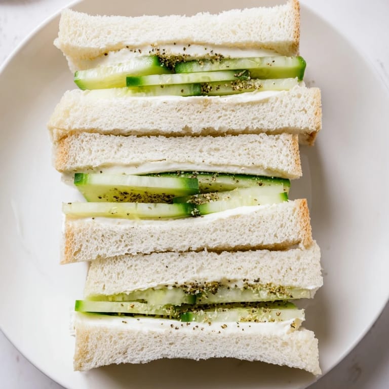 - Cucumber Sandwiches: 8 slices soft white bread crusts removed 4 tbsp unsalted butter softened 1/2 English cucumber thinly sliced Pinch of salt Freshly ground black pepper