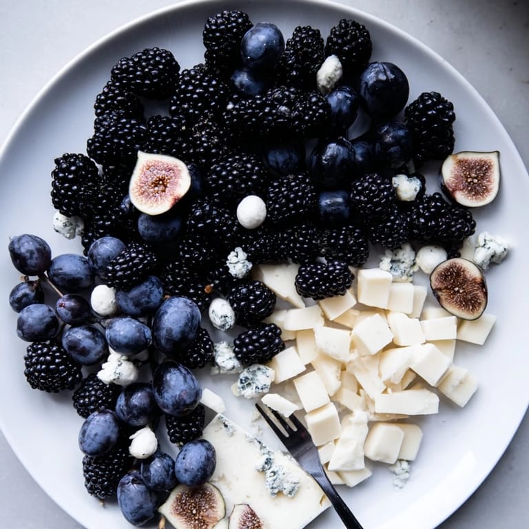 Deep, dark foods carry weight and sophistication in our minds. I discovered this entirely by accident when comparing a regular colorful cheese board to this midnight version. The darker palette makes people slow down and pay attention. It signals elegance. The small pops of cream-colored cheese become even more striking against the darkness—they're not just food anymore, they're a visual moment. If you're ever feeling like your board needs more presence, remember that sometimes what you remove is as important as what you add.