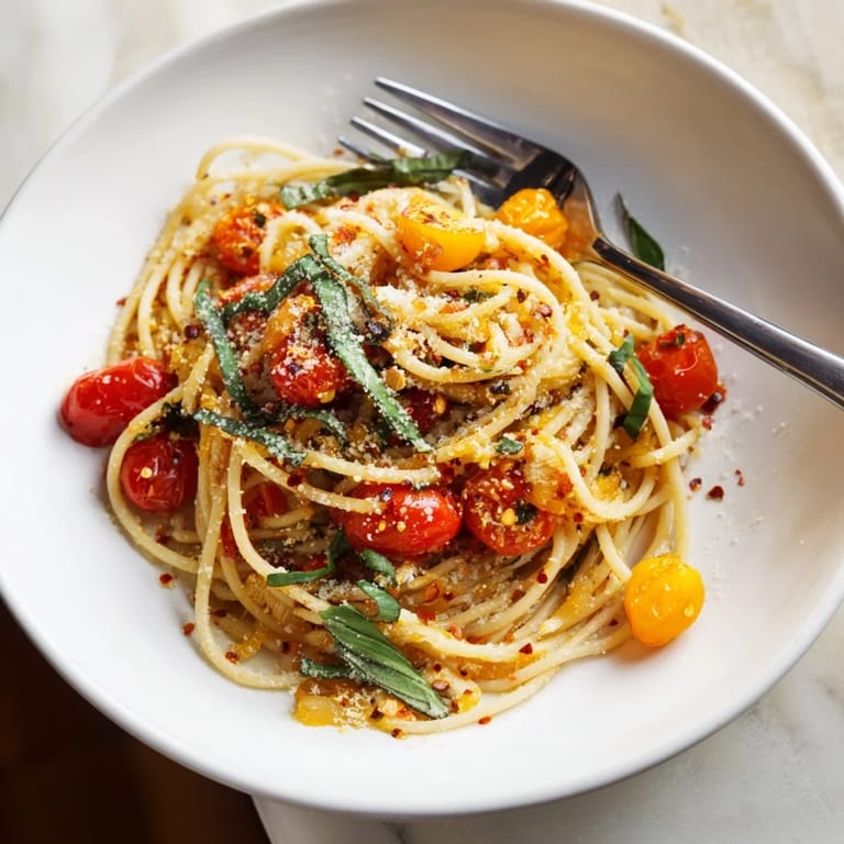 Garlic sautéed in olive oil combined with cherry tomatoes and optional red pepper flakes creates a rich, aromatic base.