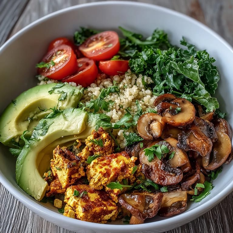 - Divide the couscous between two bowls, then top with scrambled tofu, sautéed mushrooms, and kale. Add any garnishes you like, fresh parsley, sliced avocado, cherry tomatoes, or a squeeze of lemon, and serve immediately while everything is warm.