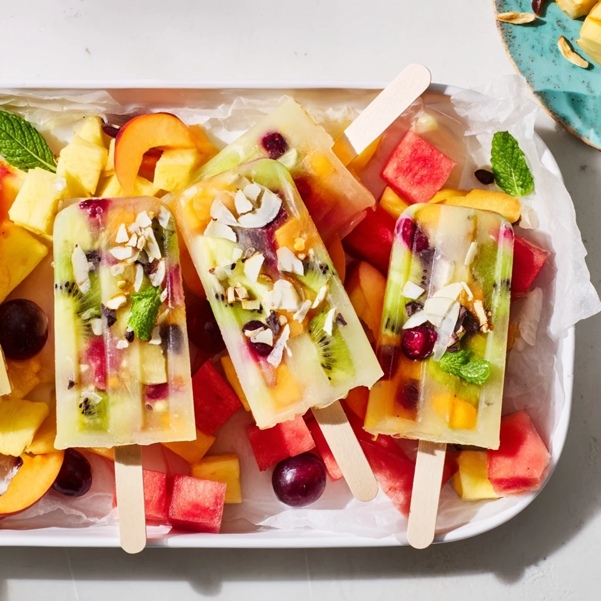 Pin Making these popsicles at home allows you to control the ingredients and tailor flavors to your liking. The combination of orange juice and creamy coconut milk creates a tropical base, while the burst of mixed berries, kiwi, and peach adds natural sweetness and texture. Accompanied by fresh fruit and toppings, this board turns a simple frozen treat into a festive summer centerpiece that’s as beautiful as it is delicious.