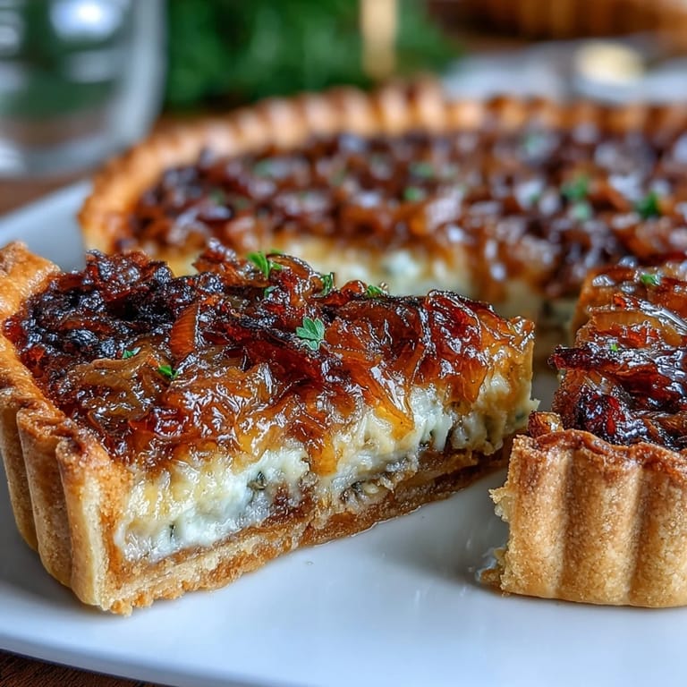 Pin There's something almost meditative about standing over a skillet of onions for half an hour, watching them transform from sharp and pale to deep amber ribbons. I discovered this tart on a gray Sunday when I had nowhere to be, just a farmers market bag of onions and the sudden urge to make something that felt more refined than my usual weekend cooking. The smell that filled my kitchen that afternoon—buttery, sweet, almost caramel-like—made me understand why the French have spent centuries perfecting this simple combination of onions, cheese, and pastry.