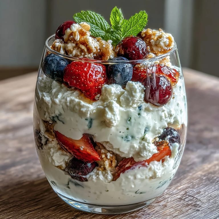 Pin A light, protein-packed parfait featuring creamy cottage cheese, fresh berries, and crunchy granola—perfect for a satisfying, low-calorie breakfast. This American-style dish takes only 10 minutes to prepare and requires no cooking, making it ideal for busy mornings.