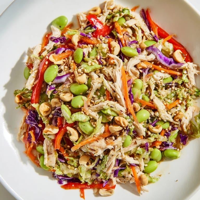 Pin One humid afternoon in late spring, I stood in my kitchen staring at a rotisserie chicken and a bag of frozen edamame, determined to throw together something that felt light but satisfying. I had just gotten back from a long walk and wanted crunch, color, and something that wouldn't weigh me down. What started as a fridge cleanout turned into one of those accidental wins you end up making on repeat. The ginger dressing came together in under two minutes, and suddenly everything in that bowl made sense together.