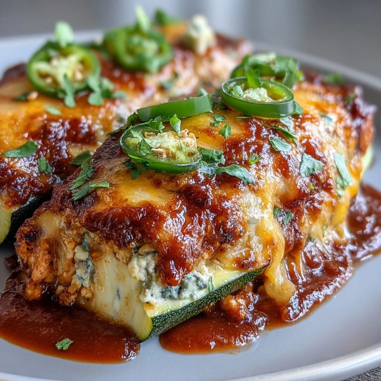 This dish features tender zucchini halves hollowed out and filled with a savory blend of shredded chicken, chili-spiced enchilada sauce, and aromatic seasonings. Baked until tender and topped with melted cheese, it offers a satisfying and flavorful low-carb alternative to a Mexican classic. Garnishes like fresh cilantro, jalapeño, and avocado add freshness and a mild kick, completing this easy-to-make meal ideal for a keto-friendly lifestyle.