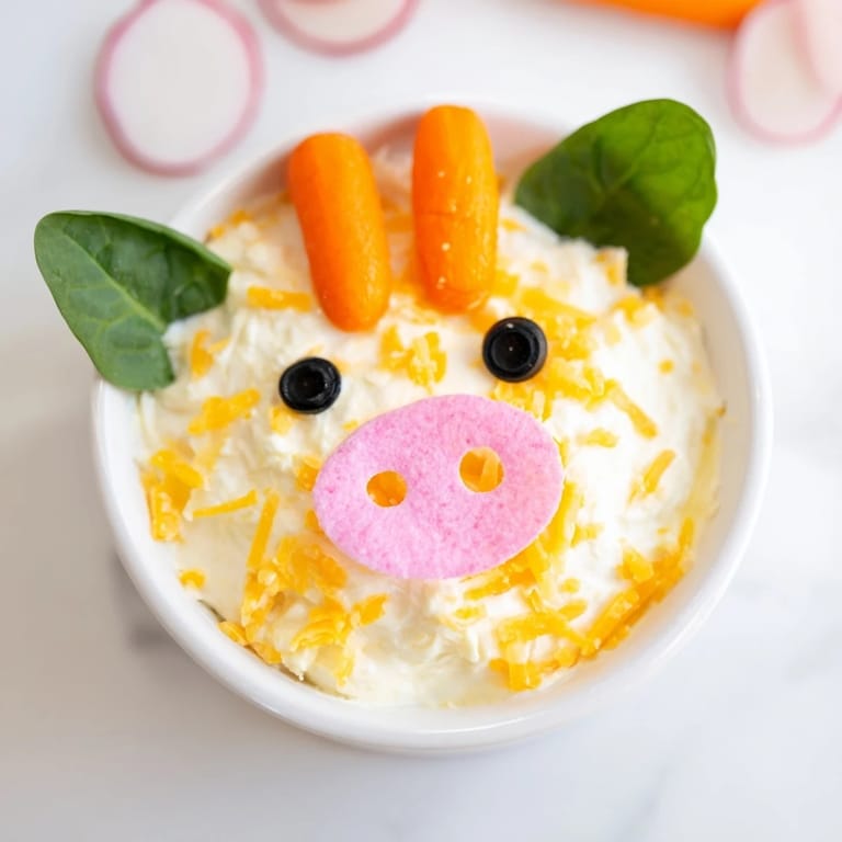Pin A whimsical farm-themed appetizer featuring a creamy dip served in a charming piggy face made from vegetables, surrounded by fresh, crunchy dippersβperfect for parties and kids.
