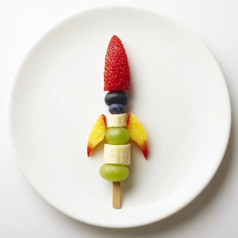 - Fresh Fruit: 8 large strawberries (rocket tips), 1 cup pineapple chunks (rocket flames), 1 cup green grapes (rocket body), 1 cup blueberries (decorative windows), 1 banana, sliced thickly (rocket body)