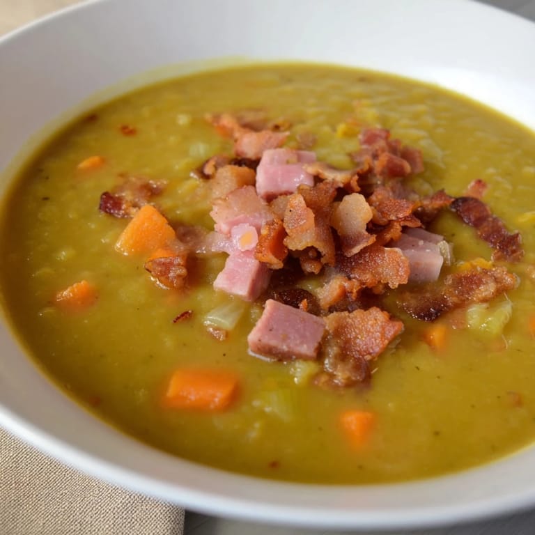 This soup combines dried split peas with savory smoked bacon and canned ham to deliver rich, smoky depth. Onions, carrots, celery, and garlic soften to create a flavorful base, then simmer slowly in low-sodium broth until the peas become tender. Optional blending offers a creamy texture while reserved crispy bacon adds a crunchy topping. Ideal for chilly days, its naturally gluten-free composition supports a comforting and filling meal. Variations include vegetarian swaps and added herbs or vegetables for versatility.