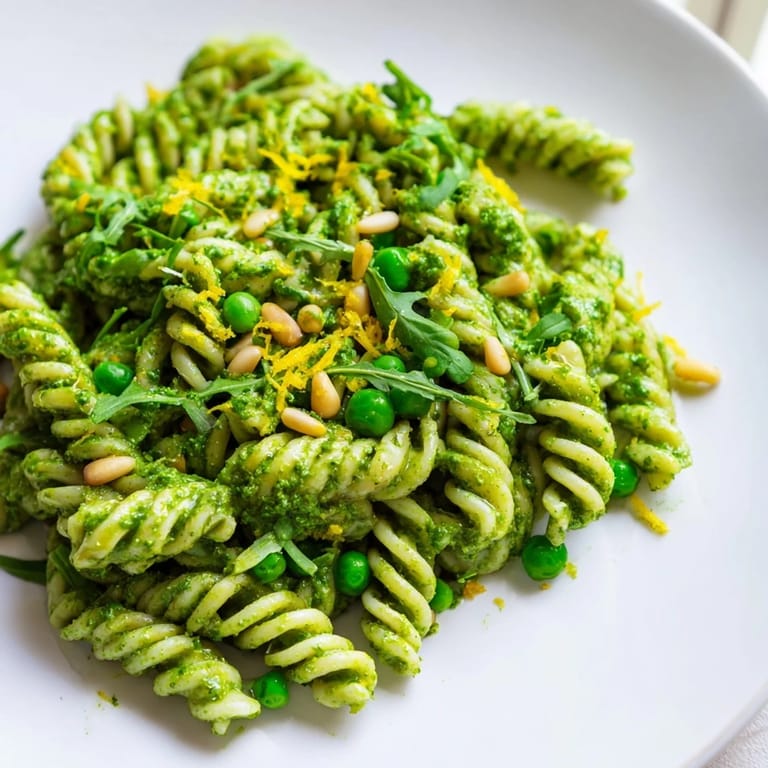Pin My neighbor knocked on my door one Saturday morning holding a bag of basil so overgrown she didn't know what to do with it. We stood in my kitchen, tearing leaves and toasting pine nuts, and by noon we had a bowl of this pasta salad sitting between us on the counter. The arugula added a sharp bite I hadn't expected, and the peas made it feel like spring had shown up early. We ate it cold, standing up, talking about nothing important.