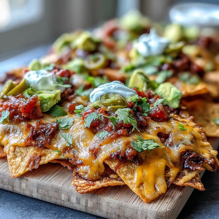 This colorful spread combines crispy tortilla chips layered with melted cheddar and Monterey Jack cheeses, complemented by black beans and fresh avocado. A zesty strawberry salsa with lime, jalapeño, and cilantro adds a bright, refreshing twist. Topped with cherry tomatoes, sour cream, pickled jalapeños, and optional olives, it’s an easy and vibrant dish ideal for summer parties or casual gatherings. Ready in just over half an hour, it offers a delicious blend of textures and flavors with vegetarian and gluten-free options.